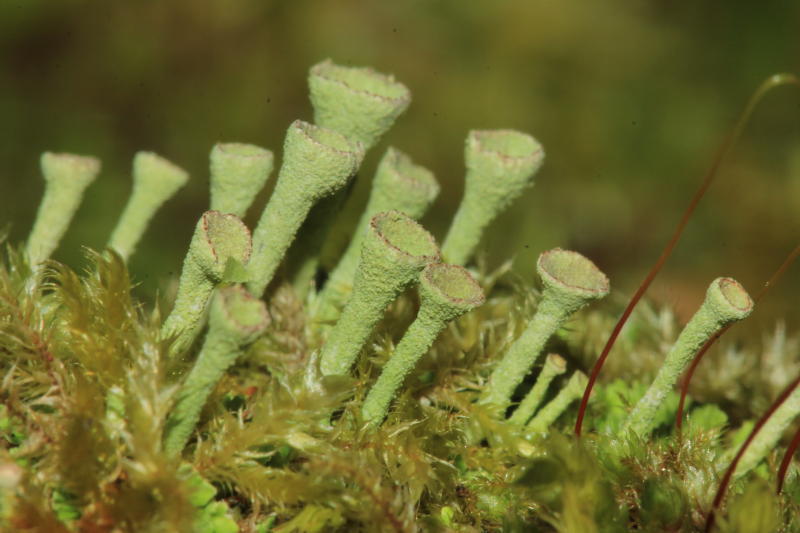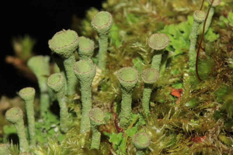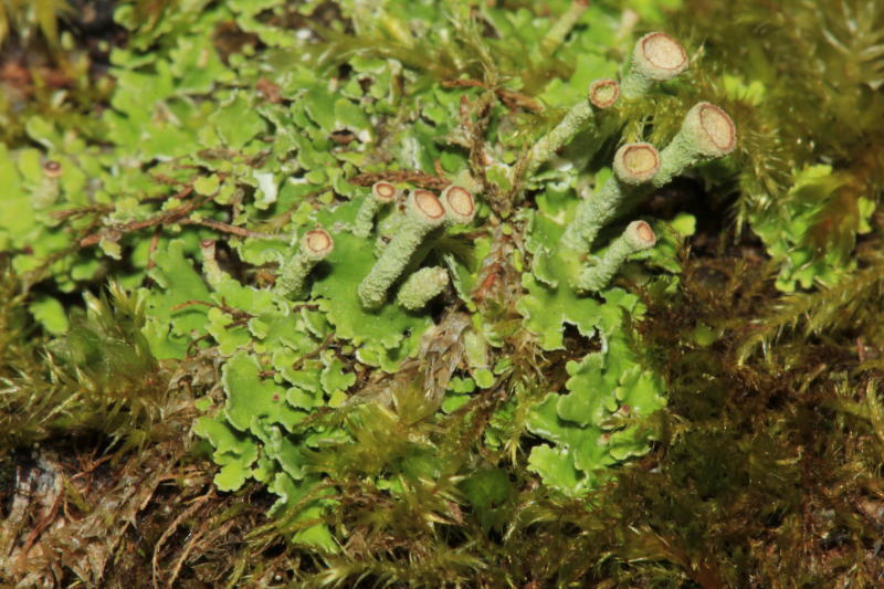 Basal squamules large (to 1cm diam), spreading horizontally and often dominant. Yellowish green-grey above, densely white farinose-sorediate below and on upturned margins. Often orange-tinged near base. Podetia to 1cm tall, apothecia and pycnidia red. young pycnidia brown and at this stage set in the in-turned cup margins as iin the images below
