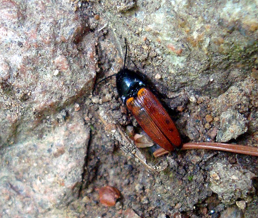 Description Black head and pronotum with bright red elytra, patterned in a slightly darker red. Longitudinal rows of pits are visible running the length of the elytra and densely scattered pits are obvious on the pronotum. The body is covered with a dense covering of black hairs which are noticeably longer than in most Elaterids. The legs are black, lightening towards the tips of the tarsi. The antennae are black and extend to the posterior edge of the pronotum.