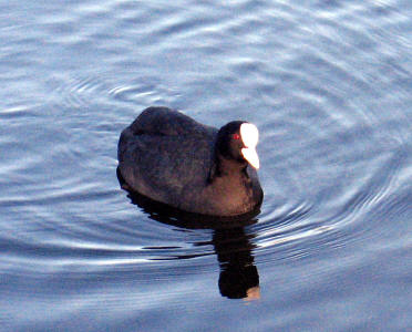Dumpy bird , with black bill with a white shield - Coots (males/females) have bare skin on their forehead that matches their shiny white bill. in contrast to their black plumage. When swimmining will nod the head rythmically , but not as musch as moorhen Males frequently fight with the white shield playing an important role in aggression display All-black and larger than its cousin, the moorhen, it has a distinctive white beak and 'shield' above the beak which earns it the title 'bald'. Its feet have distinctive lobed flaps of skin on the toes, which act instead of webs when swimming. Its feet flap noisily over the water before taking off and can be very aggressive towards others in the breeding season but outside that is seen in flocks , dives with a small flip.