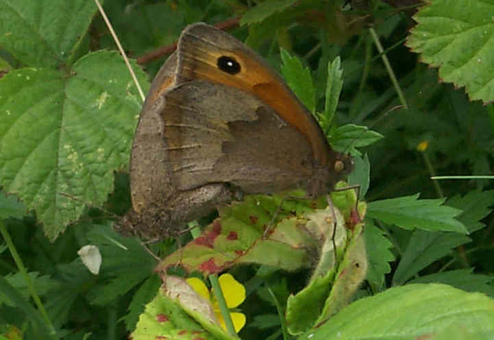 Females of the Meadow Brown are unusual as they are more distinctive than the male and are probably one of Britains Commonest Butteflies/.The females eyes stand out against strongly against the large orange patches on the upper wing side . The male is smaller and darker with a less prminent eyes. Like all Browns they have only 4 walking legs.They are seen in upland and lowland meadow and often fly on dull even wet or overcast days