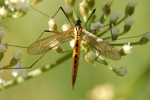 Identification Length about 18 mm. This cranefly has a yellow and black thorax and yellow abdomen with a thin and normally broken black stripe down the centre.