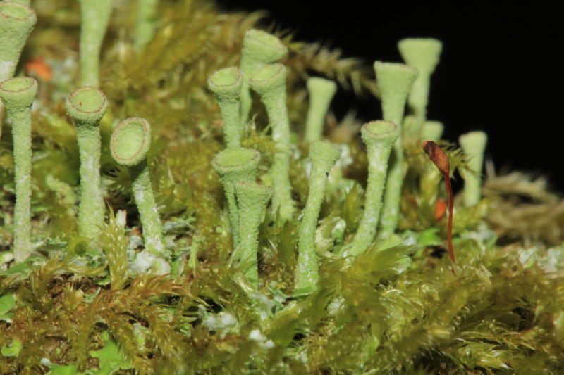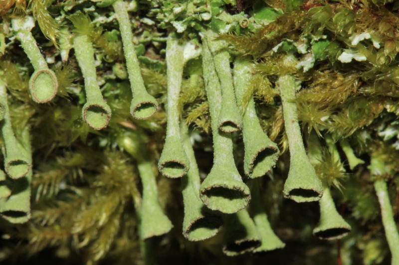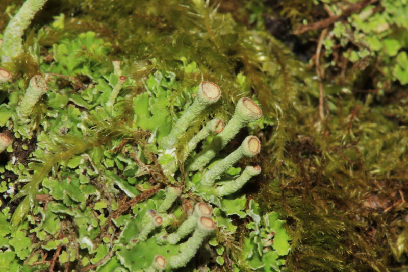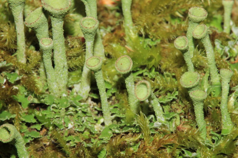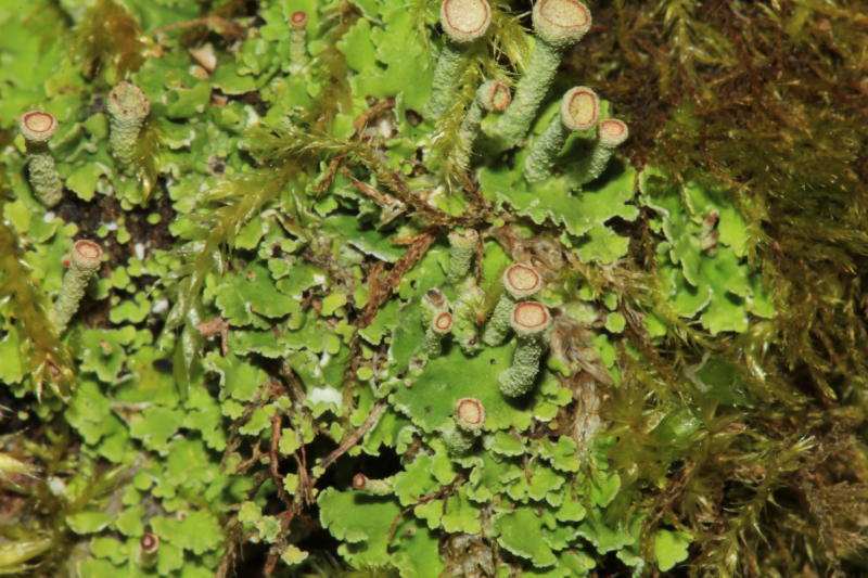 Basal squamules large (to 1cm diam), spreading horizontally and often dominant. Yellowish green-grey above, densely white farinose-sorediate below and on upturned margins. Often orange-tinged near base. Podetia to 1cm tall, apothecia and pycnidia red. young pycnidia brown and at this stage set in the in-turned cup margins as iin the images below