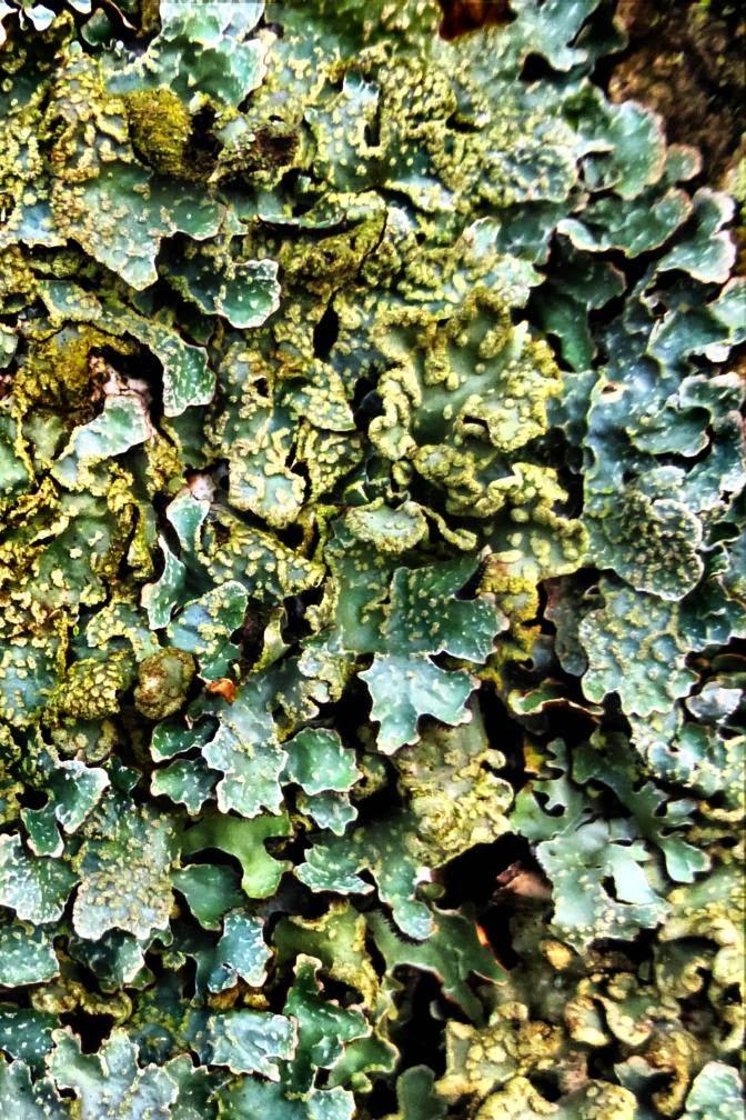A silvery grey-green Foliose lichen with dish like lobes. The lobes have a network of sharp ridges and depressions giving it a hammered or netted appearance. The yellow 'pustules' in the featured image are soralia.
