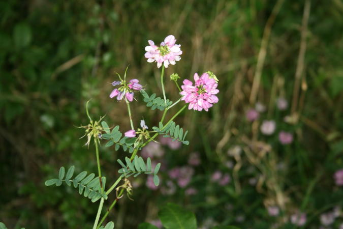 Crown Vetch (Securigera varia, formerly Coronilla varia), also called Purple Crown Vetch,Medium Tall straggly , hairless pereninal is a low-growing legume vine. The leaves are Pinnate with a terminal leaflet It has a ring of pink flowers ( flowers multicoloured Pink Liac with keel tipped blue) and the long pods break into segments. Pod 4 angled