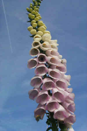 Tall, greyish biennial or perennial of woods, moors and sea cliffs. Downy, oval leaves, 20 to 30cm long, form rosette in first year. In second year, tall spikes arise bearing succession of pink-purple, tubular flowers, 40 to 50 mm long, June to September. Height up to 1.5m